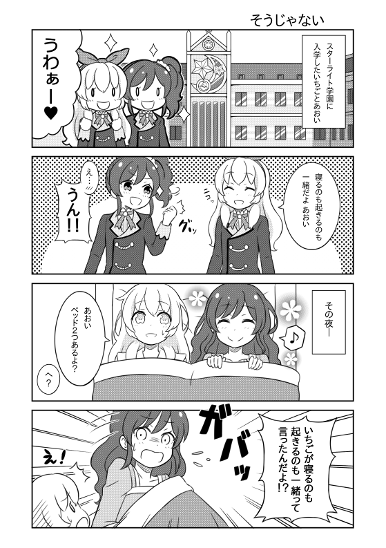 0_0 10s 2girls 4koma ^^^ ^_^ aikatsu! aikatsu!_(series) bad_id bad_pixiv_id bed blanket blazer check_(check_book) clenched_hand closed_eyes comic crescent emphasis_lines flying_sweatdrops greyscale hair_ribbon heart hoshimiya_ichigo jacket kiriya_aoi lying monochrome multiple_girls musical_note pajamas pillow quaver ribbon scrunchie side_ponytail sidelocks sparkle speech_bubble spoken_blush spoken_heart spoken_musical_note star_(symbol) translation_request under_covers
