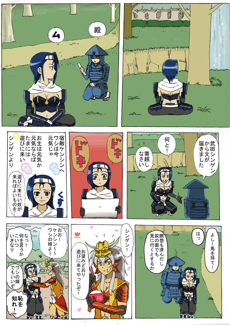 10s bad_id bad_pixiv_id comic eating japanese_clothes multiple_girls sengoku_otome soldier tabby_(pokopoko117) takeda_shingen_(sengoku_otome) translation_request uesugi_kenshin_(sengoku_otome)