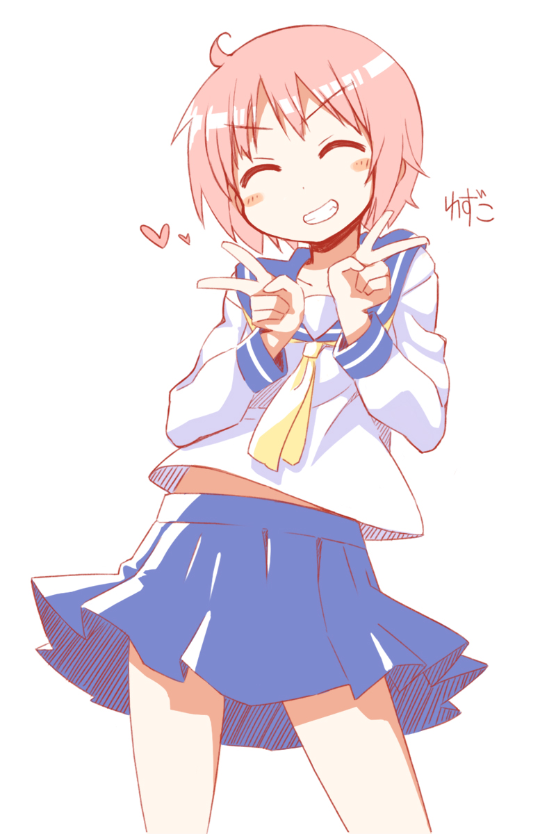 1girl baakurou blue_skirt blush blush_stickers character_name closed_eyes dot_nose double_v female_focus grin heart highres neckerchief nonohara_yuzuko pink_hair pleated_skirt school_uniform serafuku short_hair simple_background skirt smile solo v white_background yuyushiki