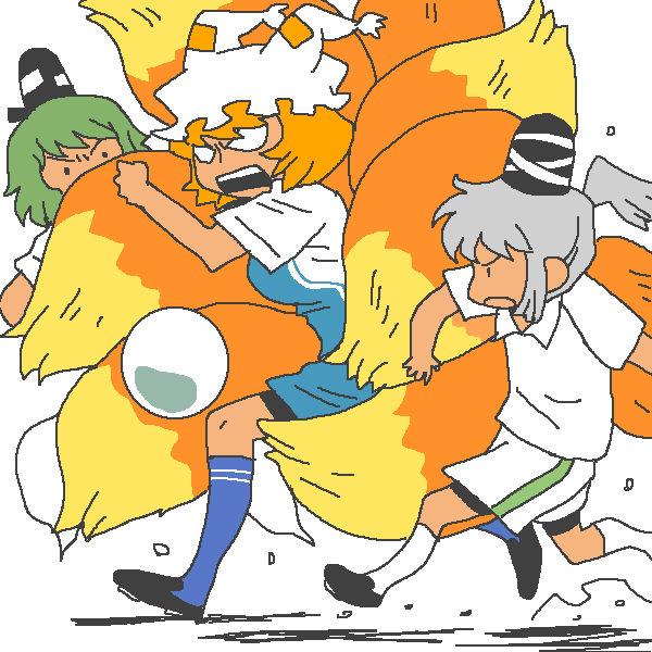 3girls american_football american_football_uniform animal_ears ball blonde_hair fox_ears fox_tail green_hair grey_hair hat long_hair mononobe_no_futo multiple_girls multiple_tails onikobe_rin short_hair soccer soccer_ball soccer_uniform soga_no_tojiko sportswear tail touhou yakumo_ran