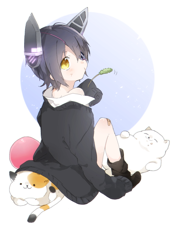 10s 1girl aged_down animal bandaid black_hair cardigan cat cat_teaser child eyepatch female_focus headgear kantai_collection looking_at_viewer oversized_clothes short_hair sino_(sionori) solo tenryuu_(kancolle) yellow_eyes
