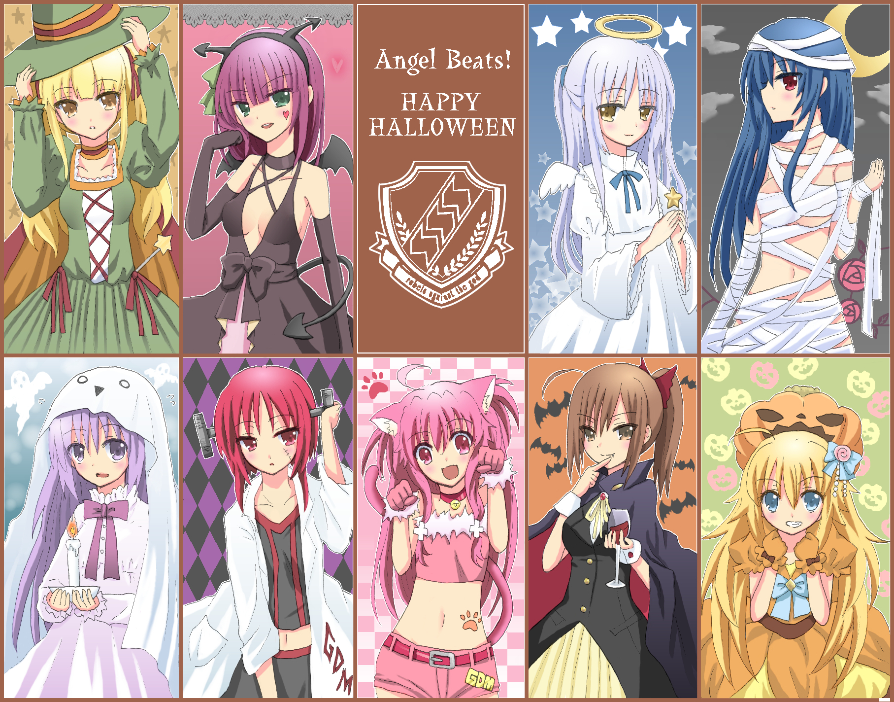 6+girls ahoge angel_beats! angel_wings animal_ears bad_id bad_pixiv_id bandages bat_(animal) bell blonde_hair blue_eyes blue_hair bow breasts brown_eyes brown_hair candle cape cat_ears cat_tail cleavage collar collarbone crescent_moon demon_tail demon_wings dress elbow_gloves fake_horns fang frankenstein's_monster frankenstein's_monster_costume ghost_costume glass gloves green_eyes grin hairband halloween halo hat heart highres hisako_(angel_beats!) horns irie_miyuki iwasawa_masami lab_coat long_hair medium_breasts midriff moon multiple_girls nakamura_hinato nakamura_yuri naked_bandage navel neck_bell open_mouth paw_pose pink_eyes pink_hair ponytail pumpkin pumpkin_hat purple_eyes purple_hair red_eyes red_hair ribbon sekine_shiori shiina_(angel_beats!) short_hair small_breasts smile star_(symbol) tail tenshi_(angel_beats!) vampire_costume white_hair wings witch_hat yellow_eyes yui_(angel_beats!) yusa_(angel_beats!)