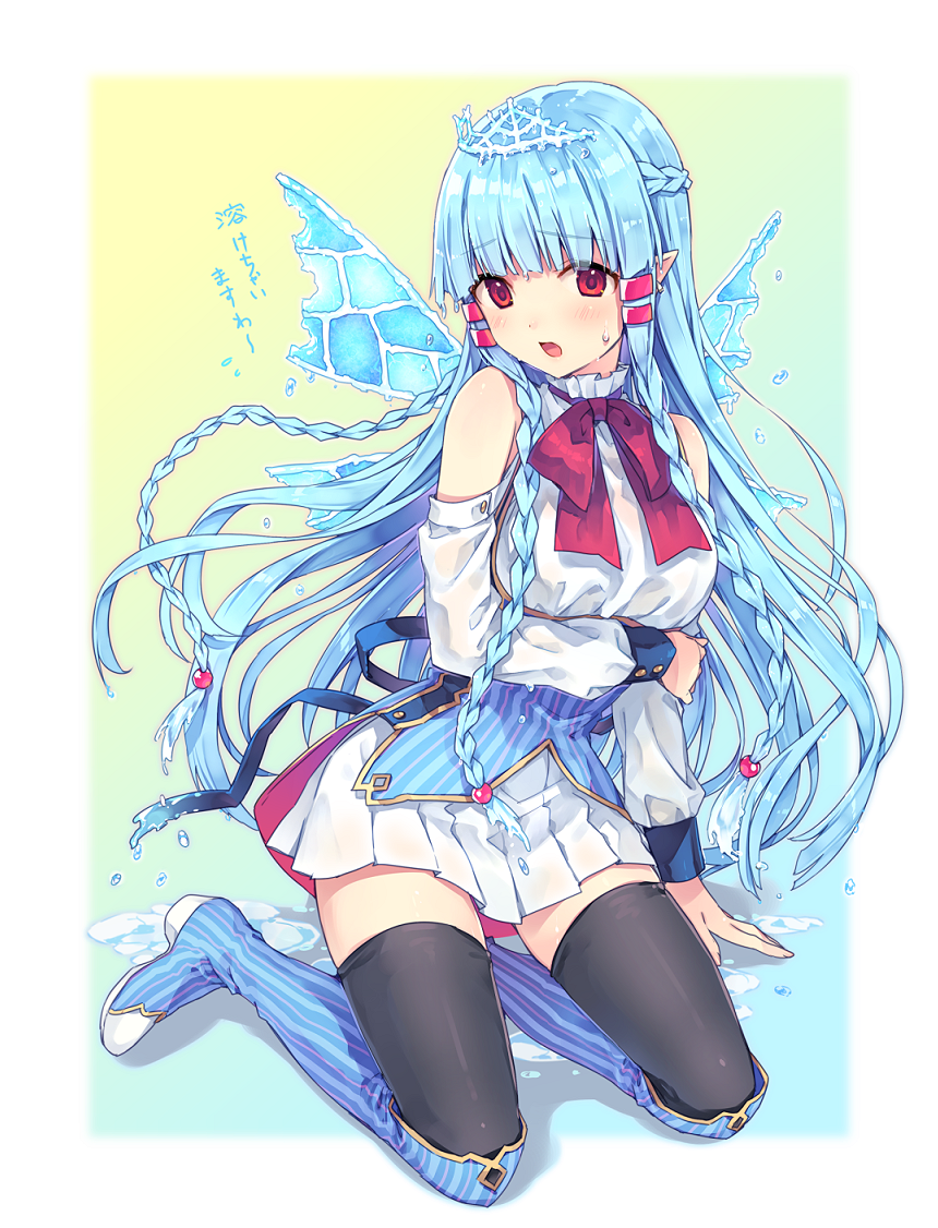 1girl bad_id bad_pixiv_id bare_shoulders blue_boots blue_hair boots braid detached_sleeves female_focus hair_ornament hair_over_shoulder knee_boots kneeling long_hair melting miniskirt nat_latework natsu_natsu original pointy_ears red_eyes ribbon simple_background skirt solo thighhighs tiara twin_braids wings