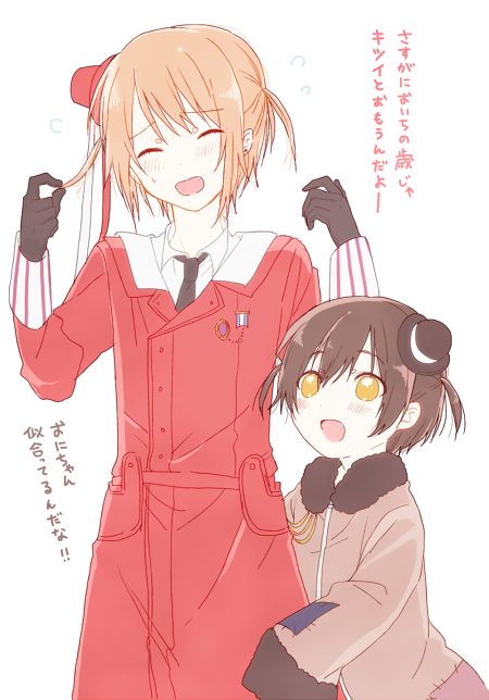 2boys ahoge axis_powers_hetalia bad_id bad_pixiv_id blush brothers brown_eyes brown_hair closed_eyes coat fang fangs gloves hat long_sleeves male_focus mgmgkyun mini_hat mini_top_hat moldova_(hetalia) multiple_boys necktie open_mouth romania_(hetalia) short_hair short_twintails siblings simple_background smile top_hat twintails white_background
