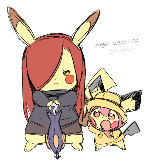 :< closed_umbrella clothed_pokemon cosplay gen_1_pokemon gen_2_pokemon hair_over_one_eye hat ice_cream_cone korean_text krieg_(skullgirls) ng_(kimjae737) nintendo no_humans parasoul_(skullgirls) parasoul_(skullgirls)_(cosplay) pichu pikachu planted planted_umbrella pokemon pokemon_(creature) raincoat red_hair skullgirls sweater turtleneck umbrella umbrella_(skullgirls) umbrella_(skullgirls)_(cosplay)