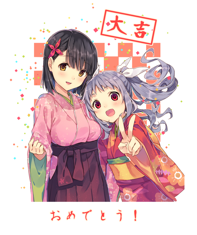 2girls :d bad_id bad_pixiv_id black_hair grey_hair hair_ornament hair_ribbon hakama hakama_skirt japanese_clothes kimono long_hair looking_at_viewer multiple_girls nat_latework open_mouth original red_eyes ribbon short_hair skirt smile twintails v yellow_eyes