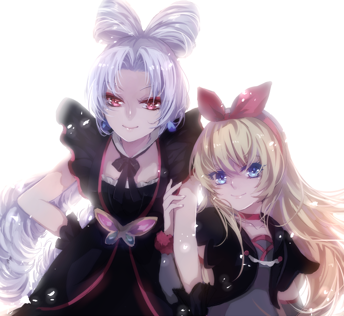 2girls akagi_towa albino black_bow blonde_hair blue_eyes bow detached_collar dokidoki!_precure earrings glowing go!_princess_precure hair_bow hairband hand_on_own_hip hu_(huhuluhu) in-franchise_crossover jewelry long_hair multiple_girls no_mask parted_bangs precure red_bow red_eyes regina_(precure) simple_background smile trait_connection twilight_(precure) white_background white_hair wrist_cuffs