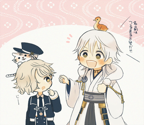 10s 2boys animal animal_on_head armor ayu_(mog) baby_animal bad_id bad_pixiv_id bird bird_on_head blush drooling duck duckling gokotai gokotai's_tigers hair_over_one_eye hat japanese_armor japanese_clothes kusazuri male_focus military military_uniform multiple_boys on_head open_mouth short_hair tiger tiger_cub touken_ranbu translated tsurumaru_kuninaga white_tiger
