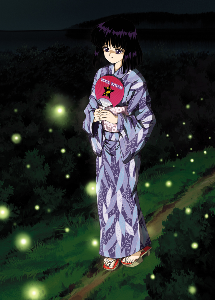 1girl bishoujo_senshi_sailor_moon black_hair bug female_focus firefly full_body geta grass hand_fan hino_ryutaro holding holding_fan insect japanese_clothes kimono name_connection night no_socks object_namesake outdoors paper_fan purple_eyes sandals short_hair smile solo standing toes tomoe_hotaru uchiwa yukata