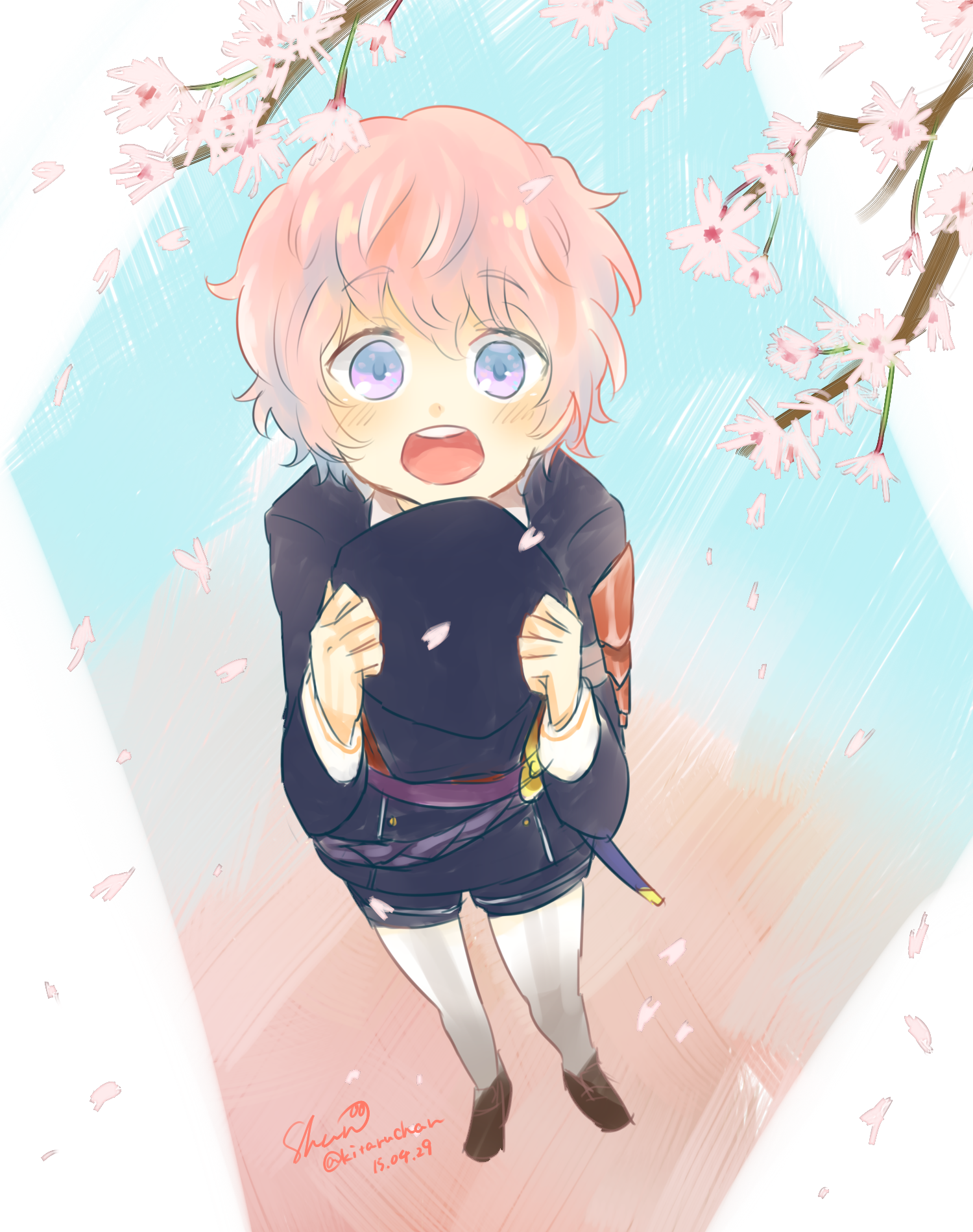 10s 1boy 1girl akita_toushirou blush branch cherry_blossoms dated female_focus full_body hat highres male_focus military military_uniform open_mouth pantyhose pantyhose_under_shorts petals pink_hair purple_eyes short_hair shorts smile solo touken_ranbu twitter_username unworn_hat unworn_headwear white_pantyhose