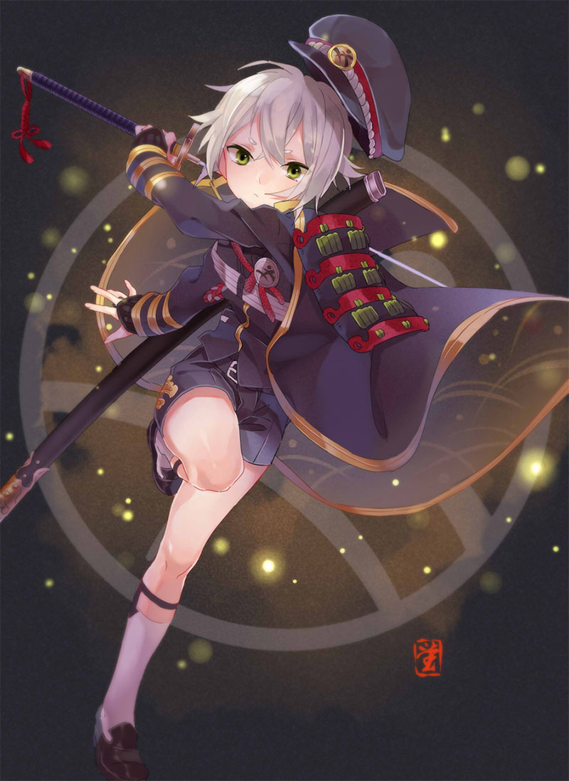 10s 1boy armor cape full_body green_eyes hair_flaps hat hotarumaru japanese_armor legwear_garter looking_at_viewer male_focus military military_uniform multiple_boys okidokei ootachi open_mouth sheath short_hair shorts shoulder_armor silver_hair socks sode solo sword touken_ranbu weapon