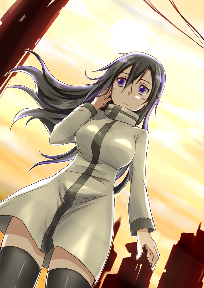 10s 1girl asuka_(aqua_space) black_hair cloud dress female_focus genderswap genderswap_(mtf) hand_on_own_ear kirito kirito_(sao-ggo) long_hair purple_eyes solo sword_art_online thighhighs zettai_ryouiki