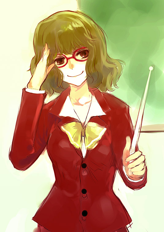 1girl bespectacled female_focus formal_clothes glasses kazami_yuuka nokishita pant_suit pants pointer smile solo suit teacher touhou
