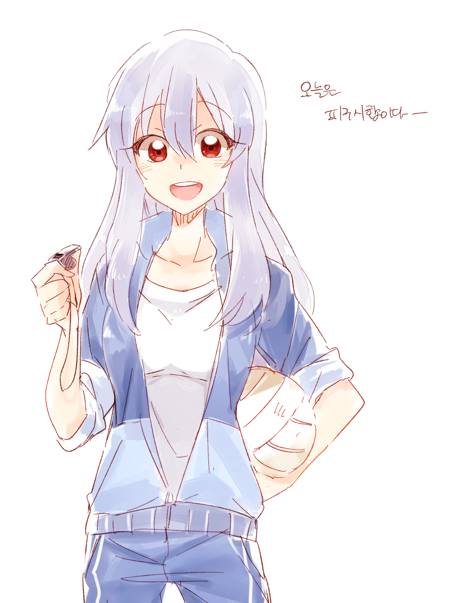 1girl 6_(yuchae) :d alternate_costume ball blush female_focus grey_hair gym_teacher highres holding holding_ball jacket kamishirasawa_keine korean_text looking_at_viewer open_mouth pants red_eyes round_teeth shirt simple_background smile solo t-shirt teeth touhou track_pants volleyball_(object) whistle