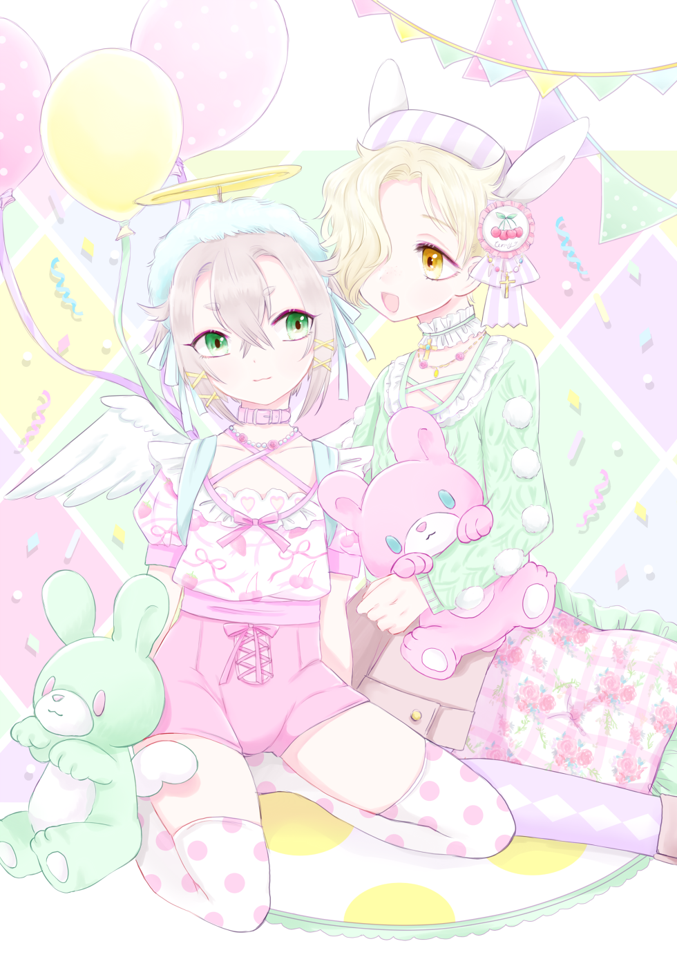 10s 2boys :3 androgynous animal_ears aqua_eyes argyle_clothes argyle_legwear balloon fairy_kei full_body girly_boy gokotai hair_over_one_eye halo highres hotarumaru male_focus michelle_(ooo-anteat) multiple_boys polka_dot polka_dot_legwear rabbit_ears short_shorts shorts smile stuffed_animal stuffed_rabbit stuffed_toy touken_ranbu trap wavy_hair white_hair yellow_eyes yume_kawaii