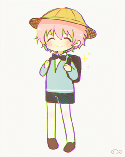 10s 1boy ^_^ akita_toushirou ayu_(mog) backpack bad_id bad_pixiv_id bag blush bow bowtie closed_eyes fish full_body hat lowres male_focus pantyhose pantyhose_under_shorts pigeon-toed pink_hair school_hat shoes short_hair shorts simple_background smile solo sparkle standing touken_ranbu white_pantyhose