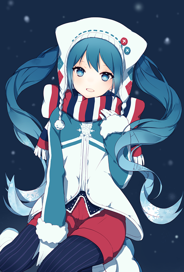 1girl blue_hair blue_pantyhose female_focus gloves gradient_hair hat hatsune_miku long_hair long_sleeves looking_at_viewer lpip multicolored_hair pantyhose pantyhose_under_shorts scarf shorts simple_background solo striped_clothes striped_pantyhose twintails vertical-striped_clothes vertical-striped_pantyhose vocaloid white_gloves yuki_miku yuki_miku_(2016)_(candidate_no.1)