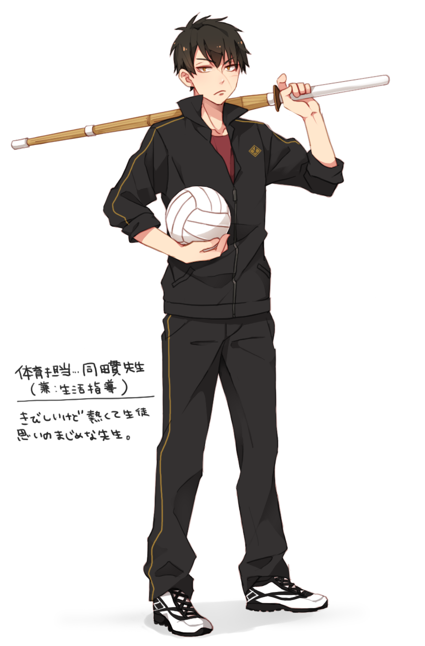 10s 1boy ball black_hair doudanuki_masakuni doutanuki_masakuni frown full_body highres holding holding_ball jacket looking_at_viewer male_focus pants scar shinai short_hair simple_background solo standing sword text_focus touken_ranbu track_jacket track_pants track_suit translation_request volleyball_(object) weapon white_background yellow_eyes yugake_(mrnmrm)