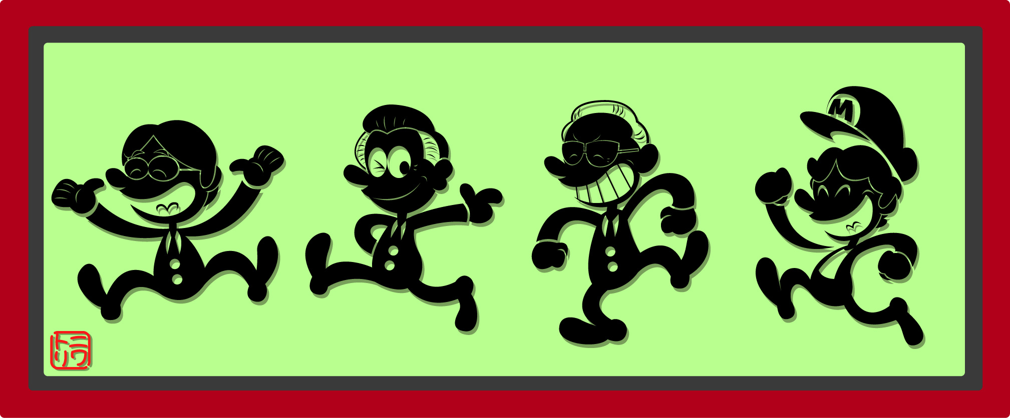 4boys border closed_eyes game_&_watch glasses grin hat highres index_finger_raised iwata_satoru male_focus miyamoto_shigeru multiple_boys necktie nintendo niwatori_(nagoyan_east) open_mouth real_life red_border simple_background smile white_hair yamauchi_hiroshi yokoi_gunpei