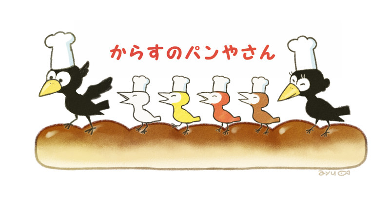 artist_name ayu_(mog) bird bread chef_hat closed_eyes copyright_name crow fish food food_focus hat karasu_no_pan'ya-san no_humans open_mouth simple_background toque_blanche white_background