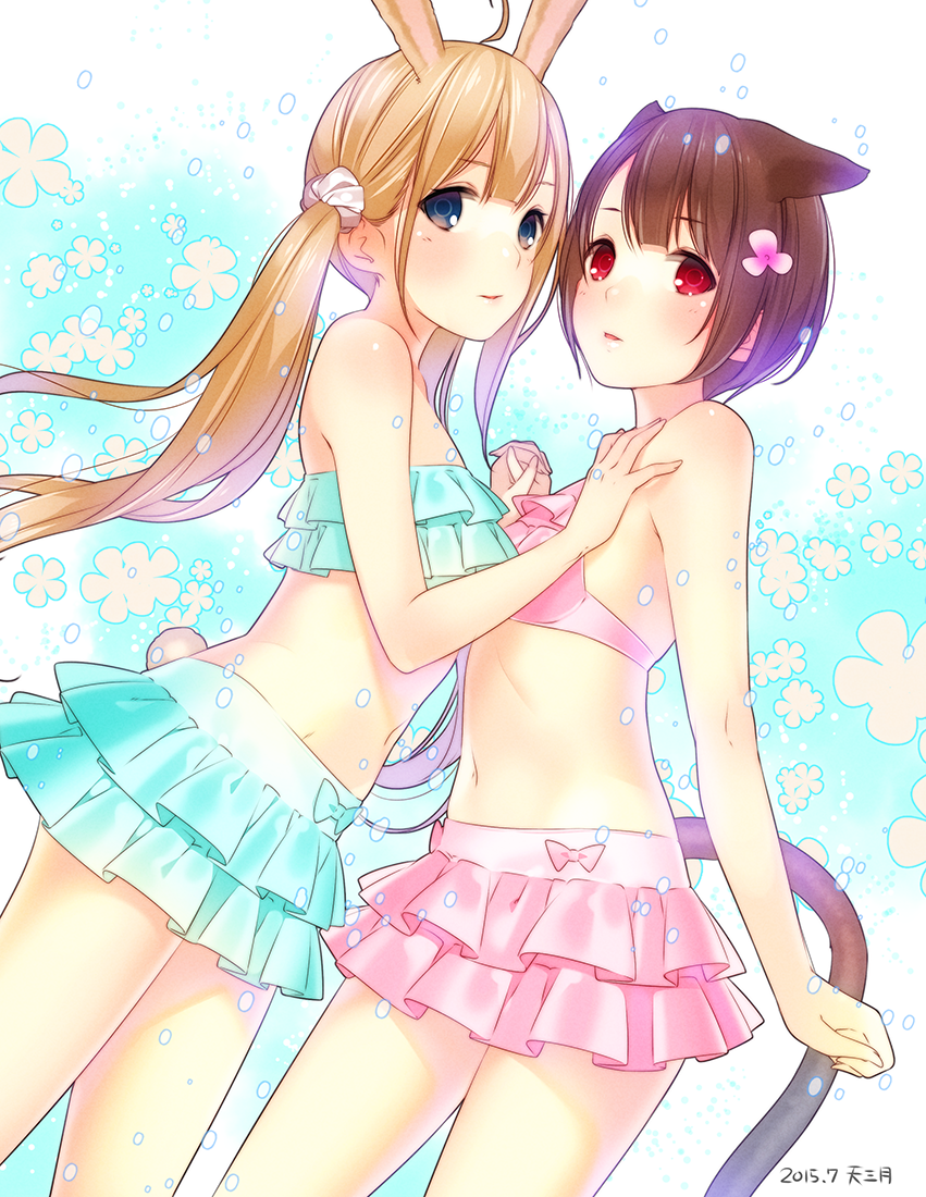 2015 2girls ahoge ama_mitsuki animal_ears aqua_bikini aqua_skirt bare_legs bare_shoulders bikini bikini_skirt blonde_hair blue_bikini blue_eyes blush bob_cut breasts brown_hair bubble cat_ears cat_girl cat_tail clenched_hand dated female_focus flower frilled_skirt frilled_strapless frilled_tube_top frills gradient_background hair_flower hair_ornament holding_hands hug interlocked_fingers legs long_hair looking_at_viewer midriff multiple_girls navel neck open_mouth original pink_bikini pink_skirt rabbit_ears rabbit_tail red_eyes scrunchie short_hair skirt small_breasts smile strapless strapless_bikini swimsuit tail tube_top twintails underwater yuri