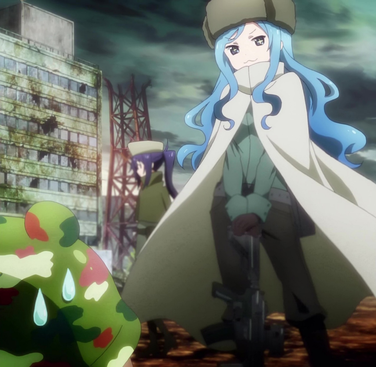10s 3girls anime_screenshot boots doma_umaru gloves highres himouto!_umaru-chan motoba_kirie multiple_girls stitched tachibana_sylphynford third-party_edit weapon