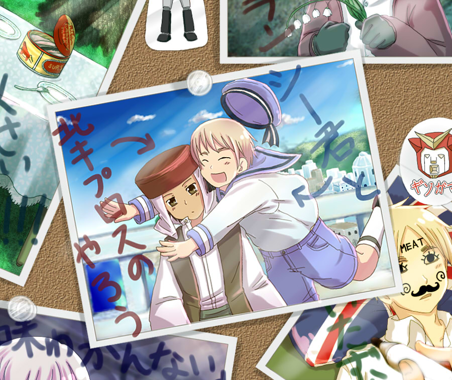 3boys ^_^ axis_powers_hetalia bad_id bad_pixiv_id blonde_hair blush brown_eyes closed_eyes dark-skinned_male dark_skin drawing_on_another's_face eyebrows fez_hat hat hug karekusa male_focus multiple_boys northern_cyprus_(hetalia) open_mouth photo_(object) sailor_collar sealand_(hetalia) shorts still_life united_kingdom_(hetalia) unworn_hat unworn_headwear