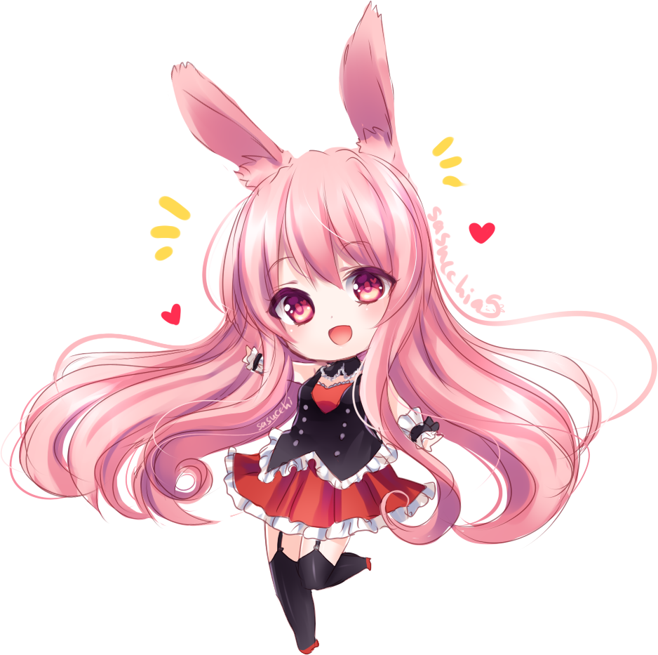 1girl ^^^ animal_ears artist_name black_thighhighs chibi female_focus garter_straps heart heart-shaped_pupils kurousagi_(mondaiji) long_hair mondaiji-tachi_ga_isekai_kara_kuru_sou_desu_yo? open_mouth pink_hair rabbit_ears red_eyes sasucchi95 simple_background skirt smile solo symbol-shaped_pupils thighhighs very_long_hair white_background wrist_cuffs