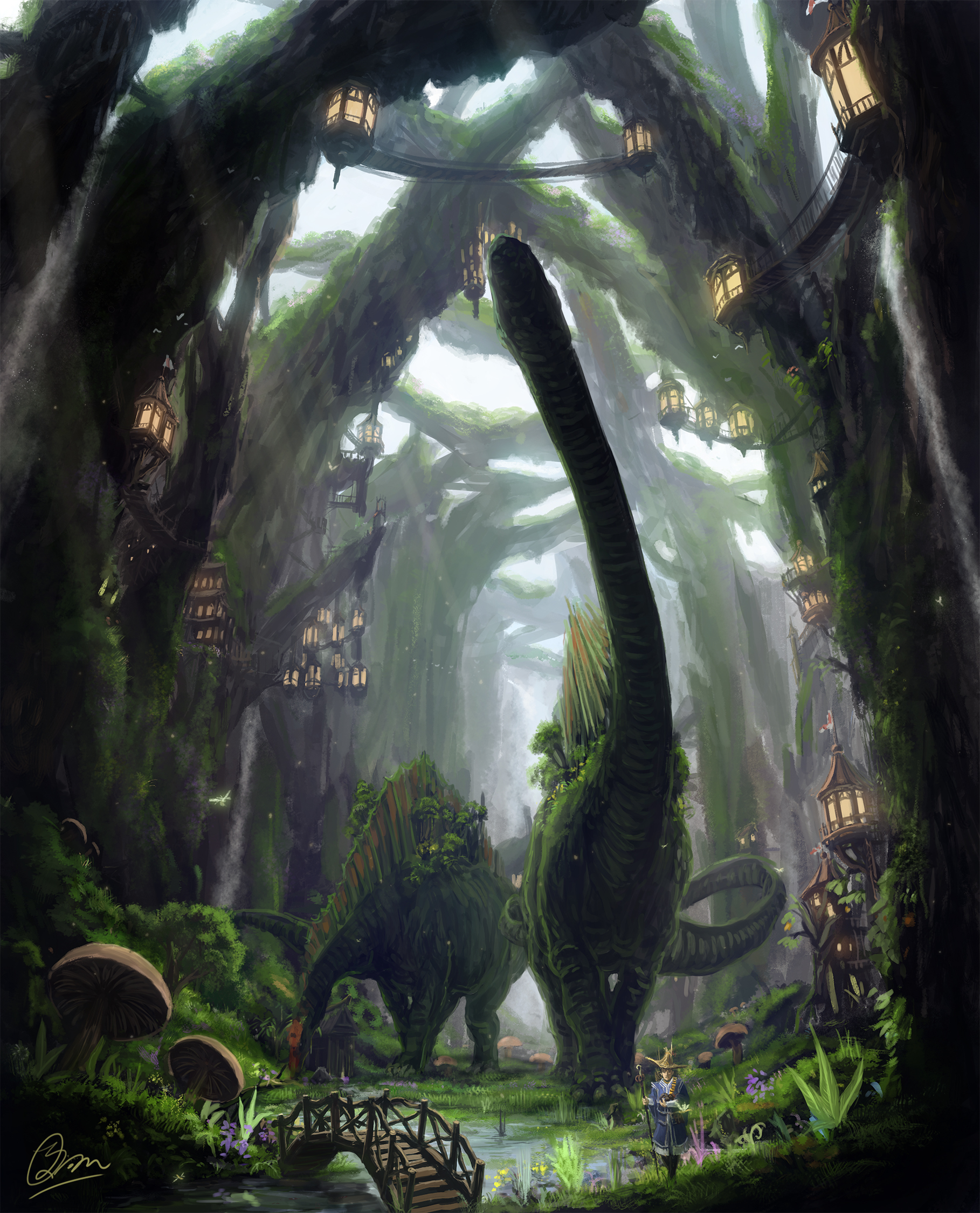 1boy backlighting bird blurry bridge depth_of_field dinosaur fantasy flower from_below giant_mushroom grand_scale grass highres light_rays makkou_4 mushroom original outdoors plant prehistoric_animal rope_bridge sauropod scenery standing sunbeam sunlight treehouse very_wide_shot water waterfall wooden_bridge
