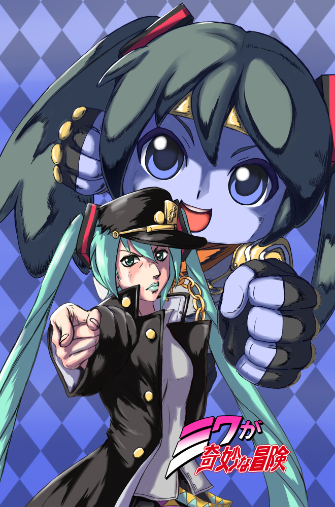 1girl aqua_hair araki_hirohiko_(style) argyle_background argyle_clothes chain cosplay gradient_background green_eyes hair_ornament hat hatsune_miku jojo_no_kimyou_na_bouken jojo_pose kujo_jotaro's_pose kuujou_joutarou kuujou_joutarou_(cosplay) long_coat long_hair mikudayo pointing pointing_at_viewer pxton stand_(jojo) star_platinum star_platinum_(cosplay) twintails very_long_hair vocaloid