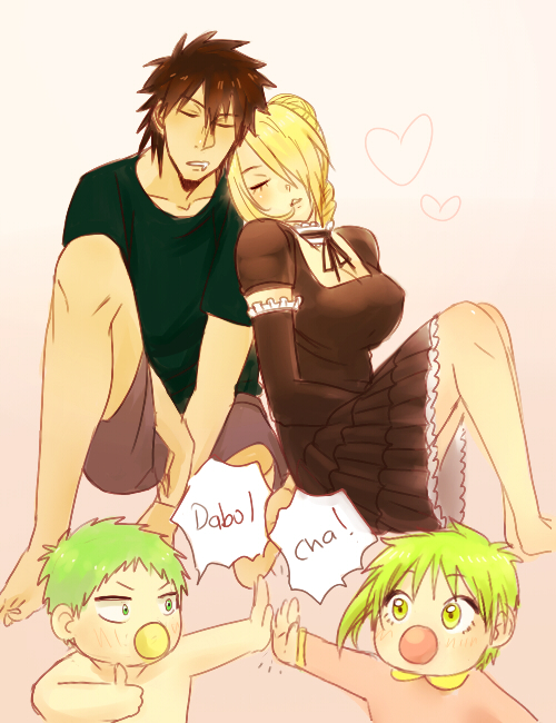 2boys 2girls baby_be'el beelzebub_(manga) black_hair blonde_hair green_eyes green_hair high_five hilda_(beelzebub) multiple_boys multiple_girls oga_tatsumi sleeping tagme