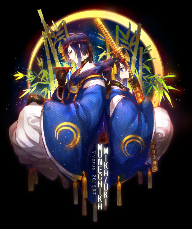 10s 2boys aged_down back-to-back bamboo blue_eyes blue_hair character_name child cup dual_persona japanese_clothes katana male_focus mikazuki_munechika multiple_boys profile sakazuki sayagata sword time_paradox touken_ranbu verus weapon