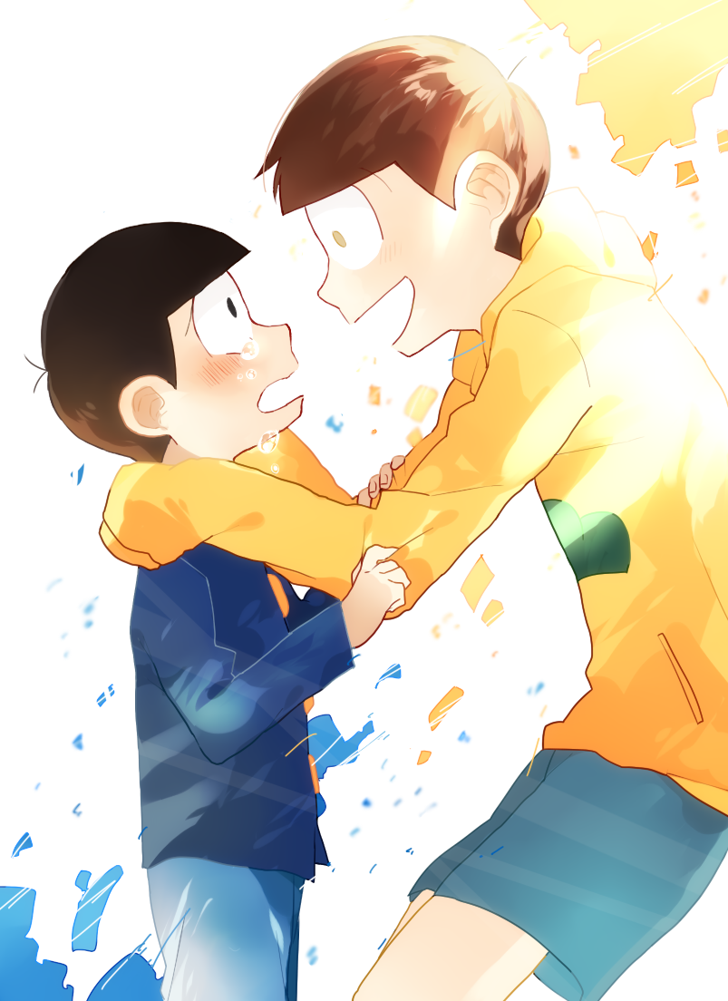 10s 2boys aged_down bad_id bad_twitter_id brown_hair child crying dual_persona hands_on_shoulders hood hoodie long_sleeves male_focus matsuno_jyushimatsu multiple_boys osomatsu-kun osomatsu-san osomatsu_(series) profile shorts sleeves_past_wrists smile tears yellow_eyes