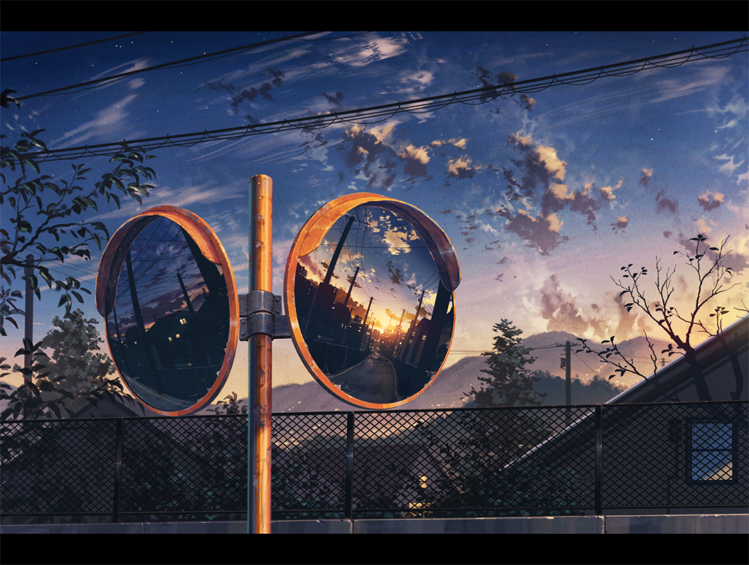 cable chain-link_fence cloud cola_(gotouryouta) curved_mirror fence house letterboxed mirror mountain no_humans original outdoors pole power_lines reflection road scenery sky smoke star_(sky) traffic_mirror tree twilight utility_pole utility_pole_(object) window