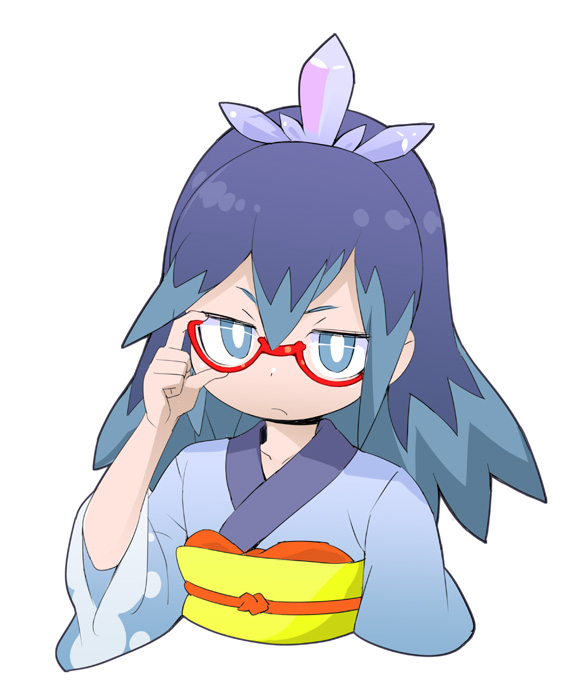 10s 1girl blue_eyes blue_hair female_focus frown fubukihime glasses high_ponytail japanese_clothes kimono long_hair looking_at_viewer matching_hair/eyes multicolored_hair ookamiuo ponytail purple_hair red-framed_eyewear semi-rimless_eyewear simple_background solo traditional_youkai two-tone_hair under-rim_eyewear upper_body white_background youkai_watch