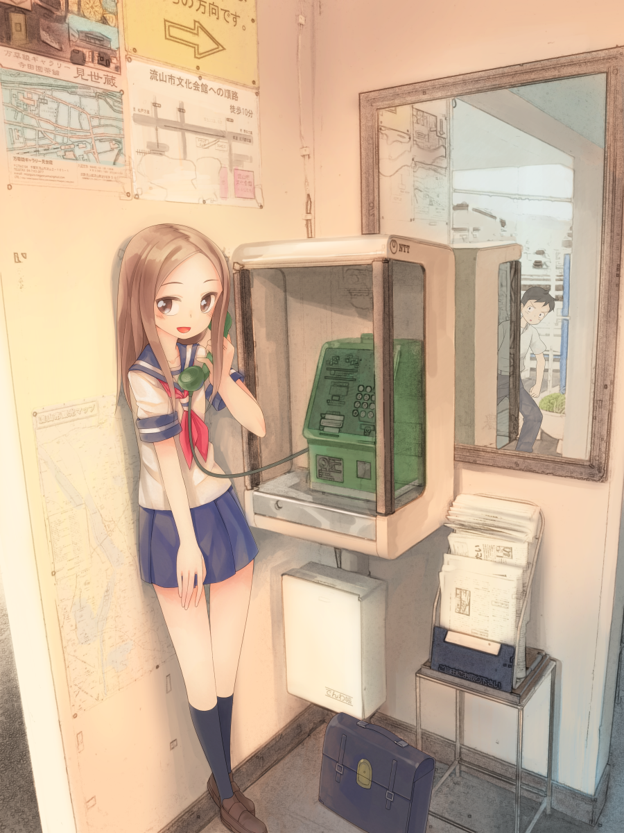 10s 1boy 1girl bag black_hair brown_eyes brown_hair highres karakai_jouzu_no_takagi-san kneehighs long_hair nishikata peaceyj phone phone_booth real_world_location school_bag school_uniform serafuku socks solo_focus takagi-san talking_on_phone