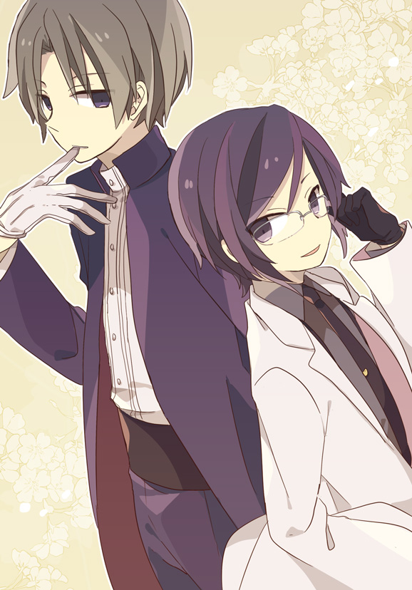 10s 2boys alternate_costume black_gloves black_hair brown_hair glasses gloves heshikiri_hasebe lab_coat male_focus multiple_boys necktie personification purple_eyes smile touken_ranbu white_gloves yagen_toushirou yoshiki