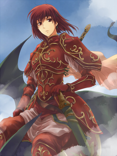 1girl armor day earrings female_focus fire_emblem fire_emblem:_mystery_of_the_emblem fire_emblem:_shadow_dragon gauntlets gloves harushino headband jewelry minerva_(fire_emblem) nintendo red_armor red_eyes red_hair riding_dragon short_hair sky solo sword weapon