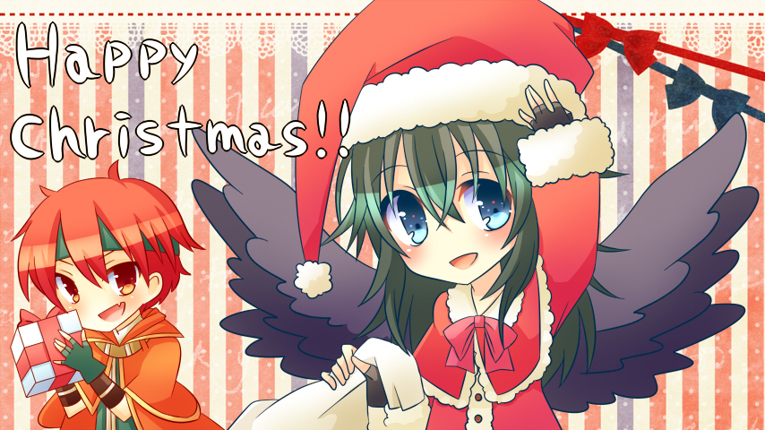 >:d 1boy 1girl :d arm_up bad_id bad_pixiv_id bird_wings black_wings blue_eyes box chibi english_text fingerless_gloves fire_emblem fire_emblem:_path_of_radiance fire_emblem:_radiant_dawn gift gift_box gloves green_hair hat headband long_hair long_sleeves merry_christmas nintendo open_mouth red_eyes red_hair santa_hat short_sleeves smile souen_senri tormod_(fire_emblem) v-shaped_eyebrows vika_(fire_emblem) wings
