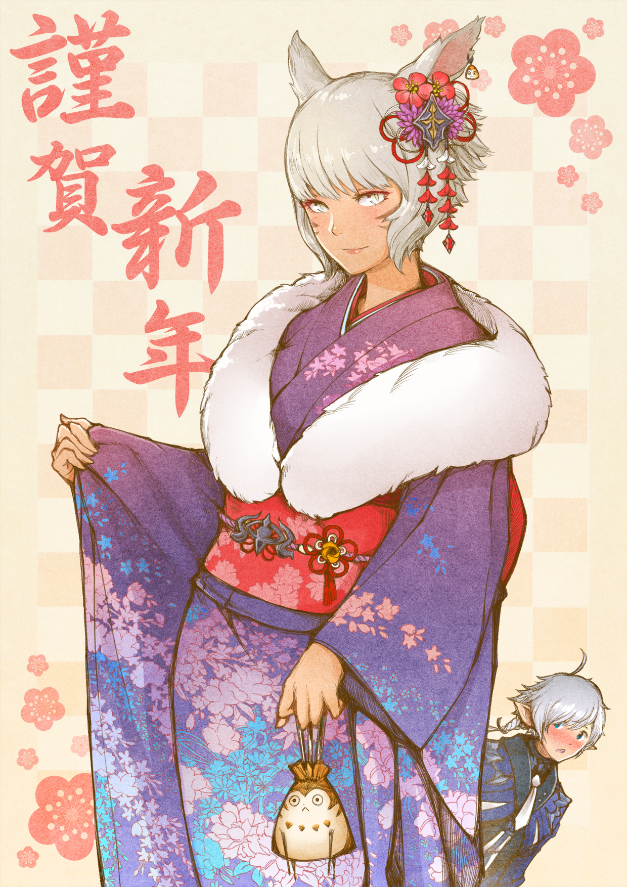10s 1boy 1girl alphinaud_leveilleur animal_ears bad_id bad_pixiv_id blind blush cat_ears checkered_background elezen elf facial_mark final_fantasy final_fantasy_xiv floral_print flower furisode grey_eyes hair_flower hair_ornament happy_new_year highres hjz_(artemi) japanese_clothes kimono looking_at_viewer miqo'te new_year obi pointy_ears sash short_hair silver_hair smile text_focus translation_request y'shtola_rhul