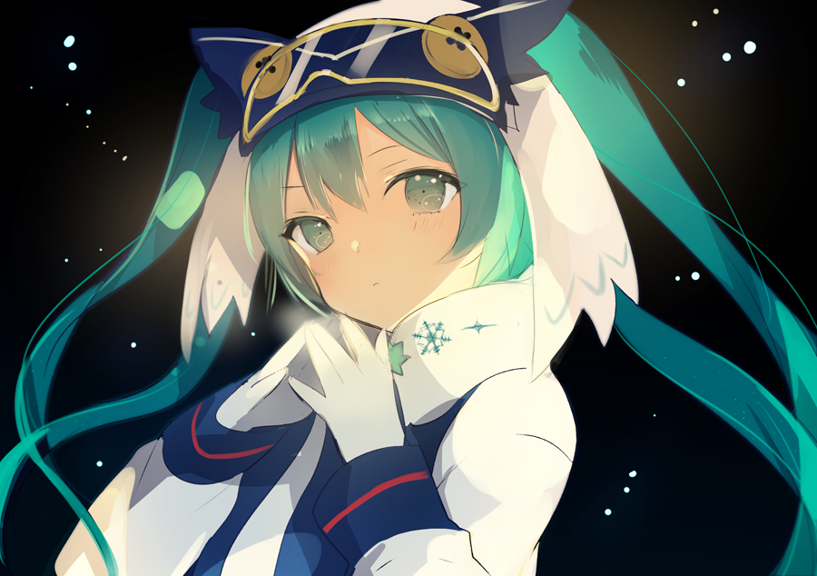 1girl black_background blue_eyes blue_hair buttons coat collar expressionless female_focus gloves goggles goggles_on_head hat hatsune_miku long_hair long_sleeves looking_at_viewer lpip matching_hair/eyes simple_background ski_goggles snowflake_print solo twintails upper_body very_long_hair vocaloid white_gloves white_hat winter_clothes winter_coat yuki_miku yuki_miku_(2016)