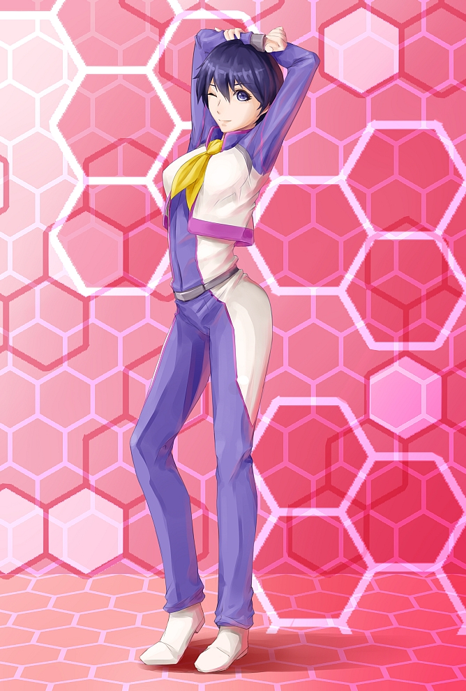 1girl arms_behind_head blue_hair claire_heathrow female_focus full_body gundam massive_kagawa one_eye_closed purple_eyes sd_gundam sd_gundam_g_generation sd_gundam_g_generation_original short_hair smile solo