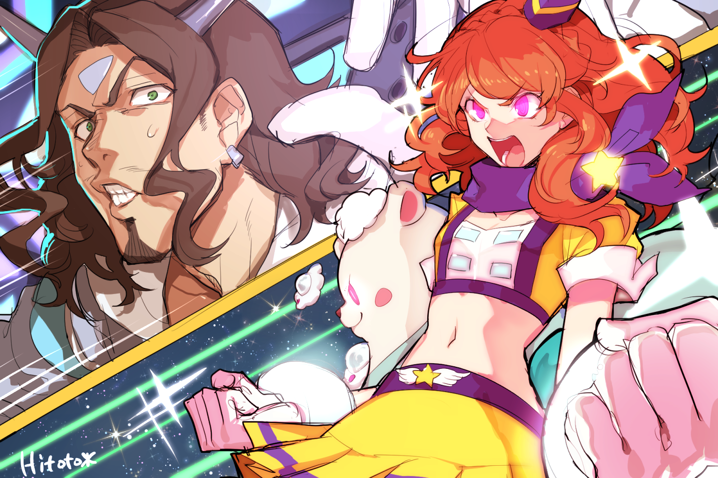 10s 1boy 1girl aikatsu! aikatsu!_(series) beard brown_hair earrings facial_hair gloves glowing glowing_eyes green_eyes hat hitoto jewelry johnny_beppu long_hair midriff mustache navel ozora_akari open_mouth red_eyes shouting sketch skirt split_screen star_(symbol) star_earrings sweatdrop
