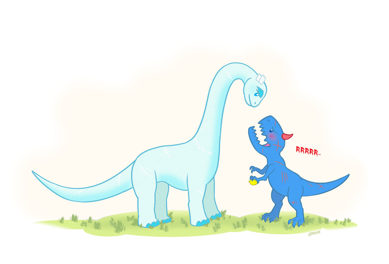 10s animalization dinosaur grass height_difference herokick horns kill_la_kill kiryuuin_satsuki matoi_ryuuko sauropod simple_background thick_eyebrows tyrannosaurus_rex