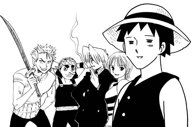 1girl 4boys black_hair chabudai_(chabu) cigarette company_connection cosplay crossover eyeshield_21 formal_clothes greyscale hair_over_one_eye hat hiruma_youichi holding holding_sword holding_weapon jonouchi_katsuya looking_at_viewer monkey_d._luffy monochrome multiple_boys nami_(one_piece) nami_(one_piece)_(east_blue) naruto_(classic) naruto_(series) one_piece parody pyuu_to_fuku!_jaguar rock_lee roronoa_zoro roronoa_zoro_(cosplay) sanji_(one_piece) sanji_(one_piece)_(cosplay) scar short_hair shounen_jump simple_background smile smoke smoking spiked_hair standing straw_hat style_parody sword upper_body usopp usopp_(cosplay) weapon white_background yu-gi-oh! yu-gi-oh!_duel_monsters