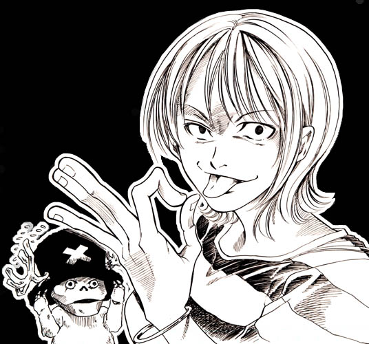 1girl chabudai_(chabu) crazy_eyes death_note greyscale money_gesture monochrome nami_(one_piece) one_piece out_of_character parody ryuk short_hair tongue tony_tony_chopper uneven_eyes