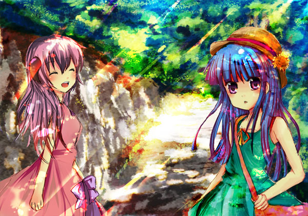 2girls blue_hair blush bow closed_eyes day dress furude_rika hanyuu hat higurashi_no_naku_koro_ni ke-a-ru multiple_girls open_mouth purple_eyes purple_hair sidelocks smile sun_hat sundress sunlight tree