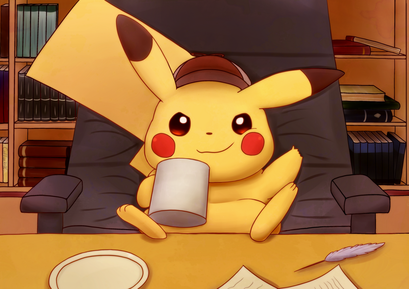 blush_stickers chair clothed_pokemon coffee_mug cup deerstalker detective_pikachu_(character) detective_pikachu_(game) detective_pikachu_(series) feet_on_table gen_1_pokemon hat mug myuu_(mewsaur) nintendo no_humans pikachu plate pokemon pokemon_(creature) quill sitting smirk solo table tail