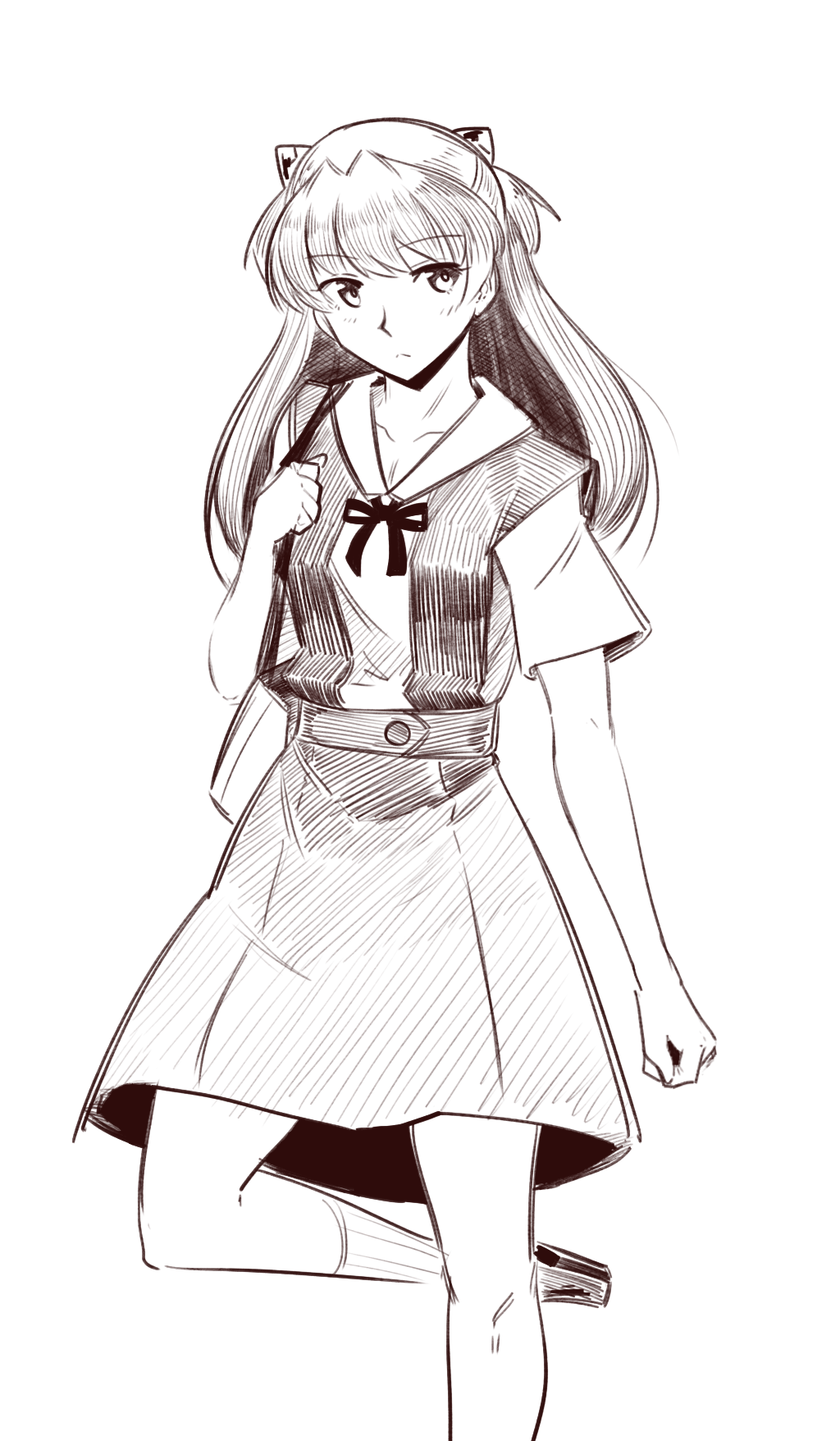 1girl artist_request bag drawfag female_focus frown greyscale handbag highres long_hair monochrome neon_genesis_evangelion school_uniform simple_background solo source_request souryuu_asuka_langley white_background