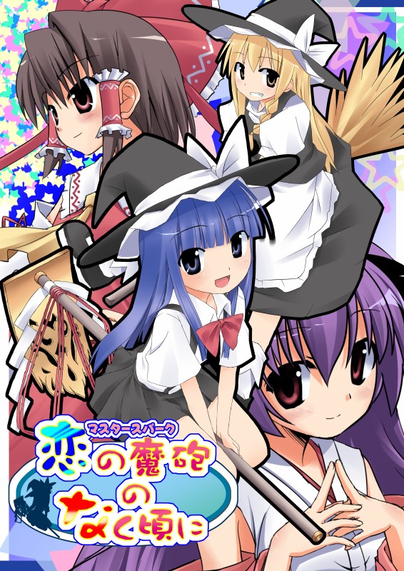 00s 4girls :d apron black_dress blonde_hair blue_hair blunt_bangs bow bowtie broom broom_riding dress duplicate female_focus furude_rika hair_bow hair_tubes hakurei_reimu hanyuu hat higurashi_no_naku_koro_ni hoshi_umi kirisame_marisa long_hair looking_at_viewer multiple_girls open_mouth pink_bow puffy_short_sleeves puffy_sleeves purple_hair red_bow red_bowtie short_sleeves sidelocks smile touhou very_long_hair waist_apron witch_hat